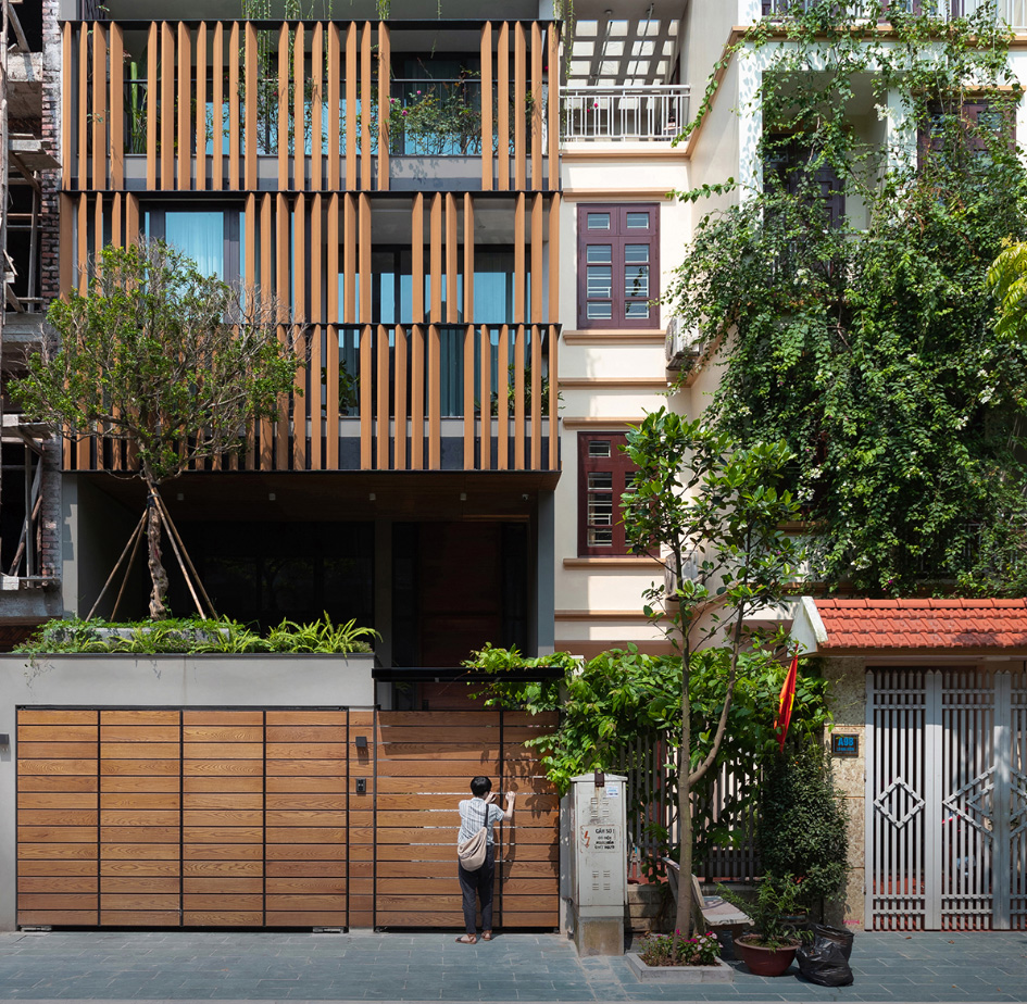 Mặt tiền được xử lý bằng hệ lam gỗ, có tác dụng giảm bớt bức xạ mặt trời và tạo hình độc đáo. Khu vườn trước nhà được nâng cao lên, tạo khoảng trống bên dưới để làm gara, giúp tránh ánh nắng và giảm được bụi, tiếng ồn của đô thị.