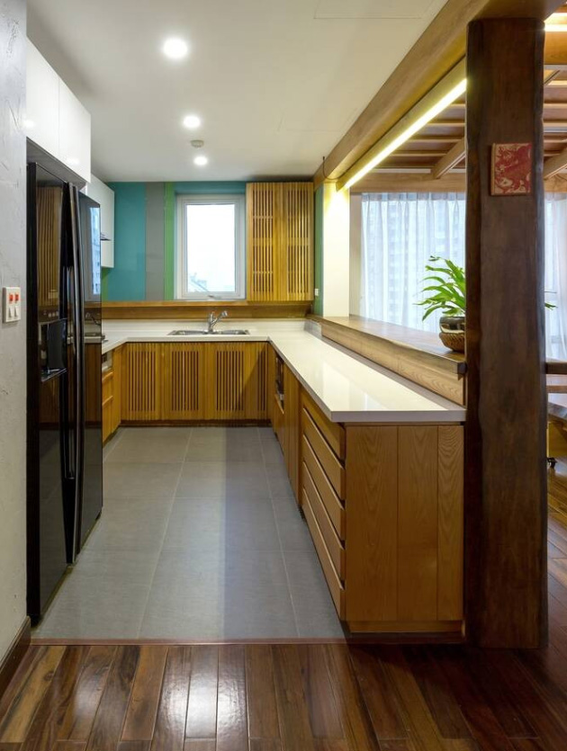 Apartment với chất liệu gỗ làm chủ đạo, được cải tạo lại mang đúng tinh thần của một căn nhà truyền thống có hệ thống cột kèo làm trụ, làm xương sống của cả ngôi nhà.